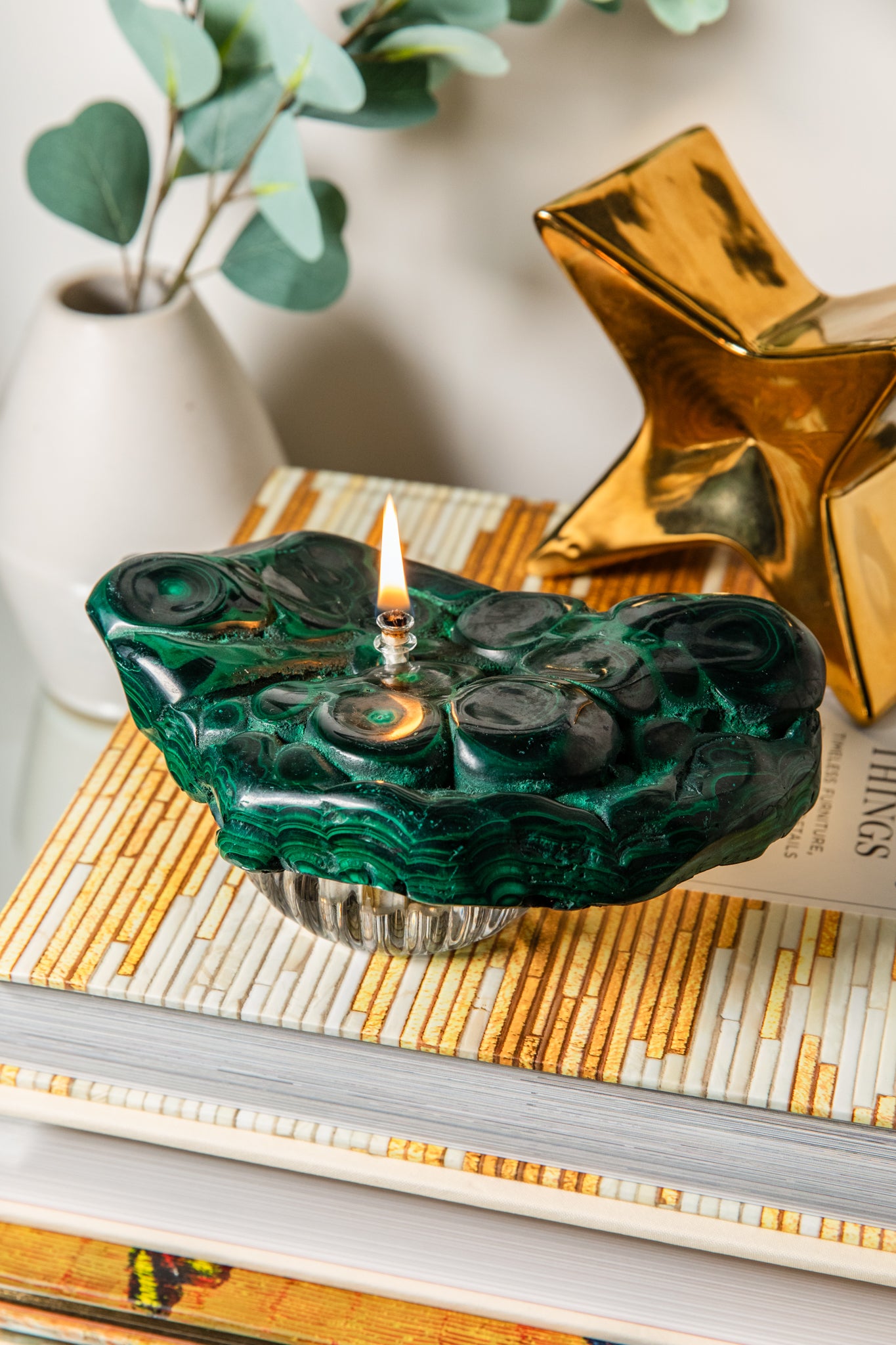 Striking bands of emerald and deep black create a natural masterpiece. Malachite is the stone of transformation, offering protection and empowering renewal with every flicker of the flame.